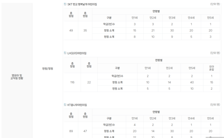 ▶ 기본현황, 정원/현재인원, 교직원수, 운영시간, 누리과정 운영시간, 어린이집 보육료, 유치원 교육료, 통학차량 운행 등