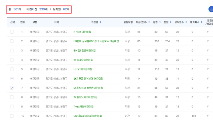 선택 조건에 따른 어린이집 및 유치원 검색도 가능하며 최대 3개의 어린이집 또는 유치원 현황 정보 비교가 가능하니 사이트가 매우 편리해졌습니다.