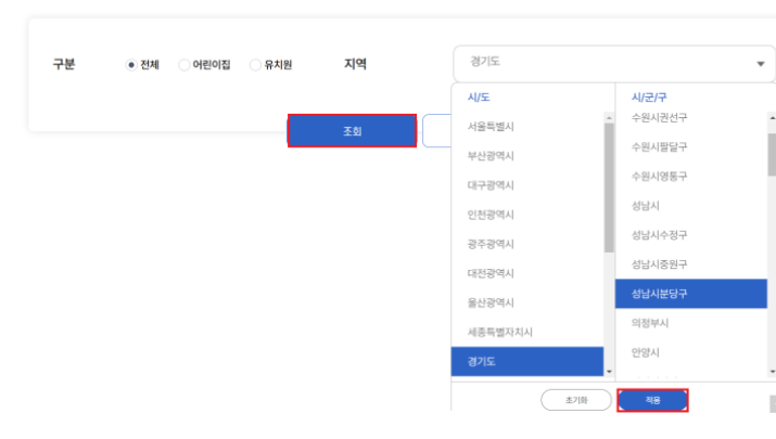 ▶ 지역을 선택하여 어린이집 및 유치원 리스트 한눈에 확인 가능